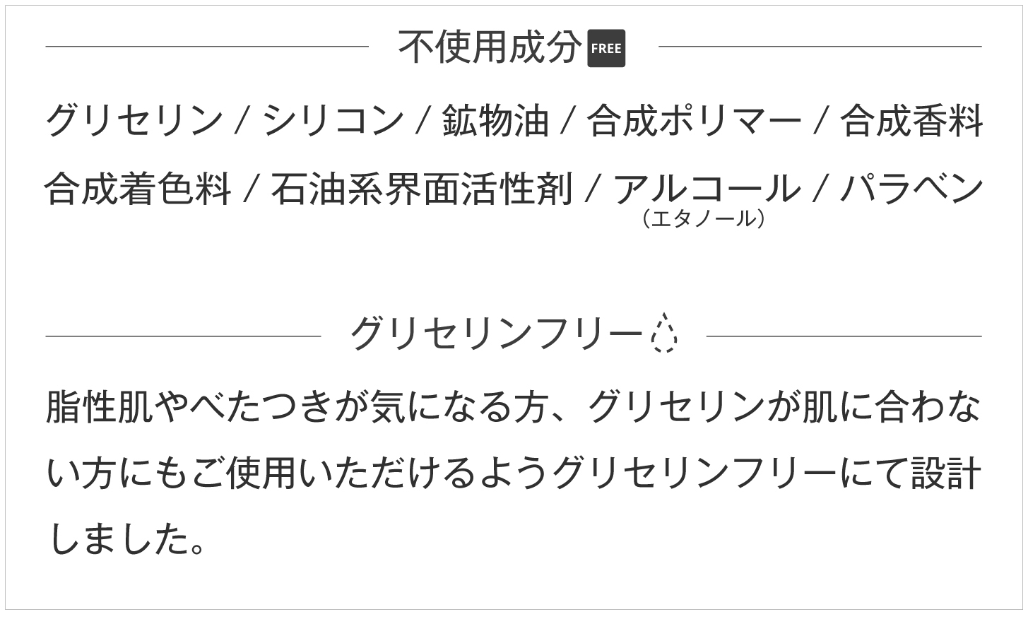 脂性肌やべたつきが気になる方、グリセリンが肌に合わない方にもご使用いただけるようグリセリンフリーにて設計しました。