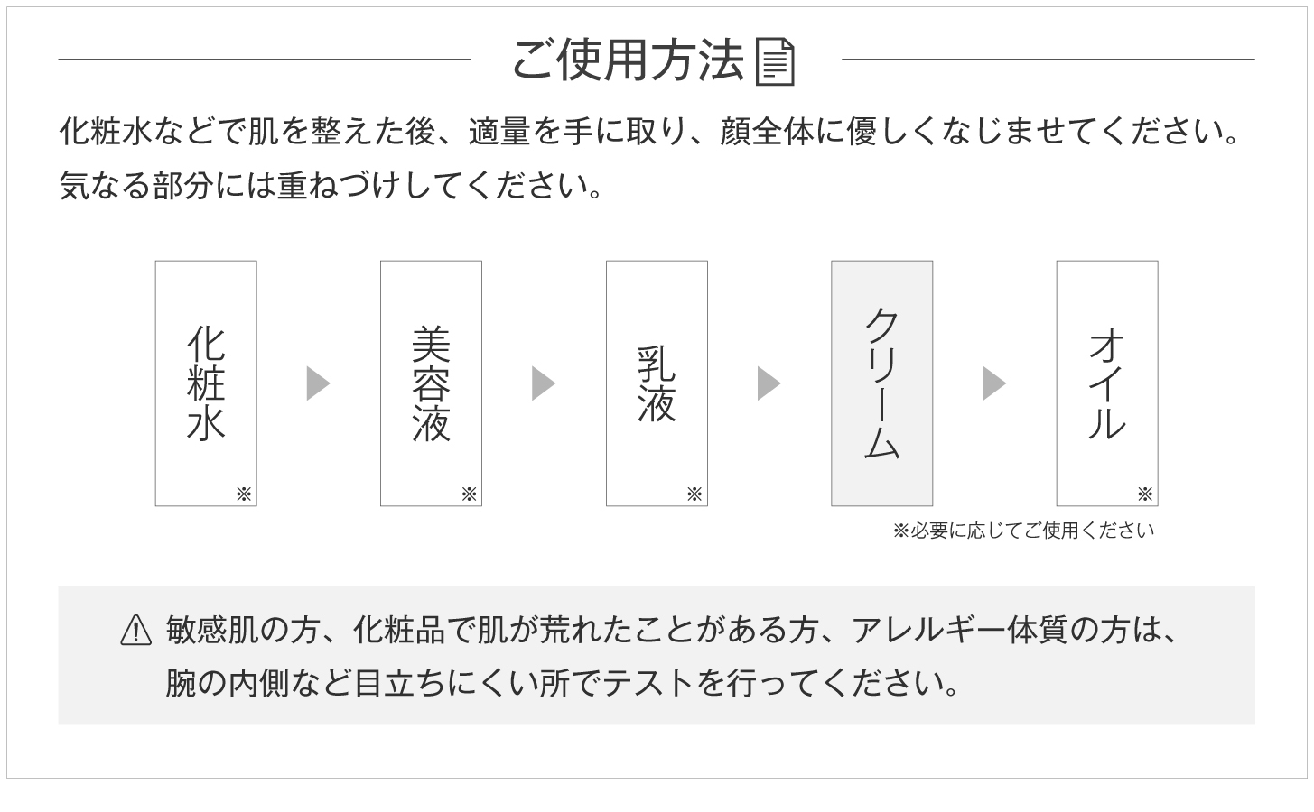 ●敏感肌の方、化粧品で肌が荒れたことがある方、アレルギー体質の方は、腕の内側など目立ちにくい所でテストを行ってください。