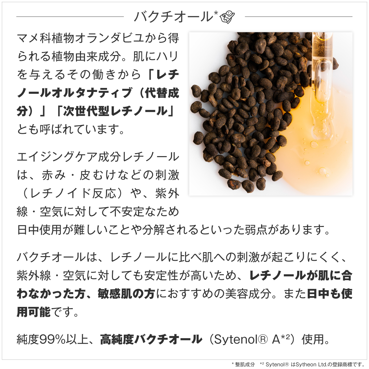 ・バクチオールは、レチノールに比べ肌への刺激が起こりにくく、紫外線・空気に対しても安定性が高いため、レチノールが肌に合わなかった方、敏感肌の方におすすめの美容成分。また日中も使用可能です。