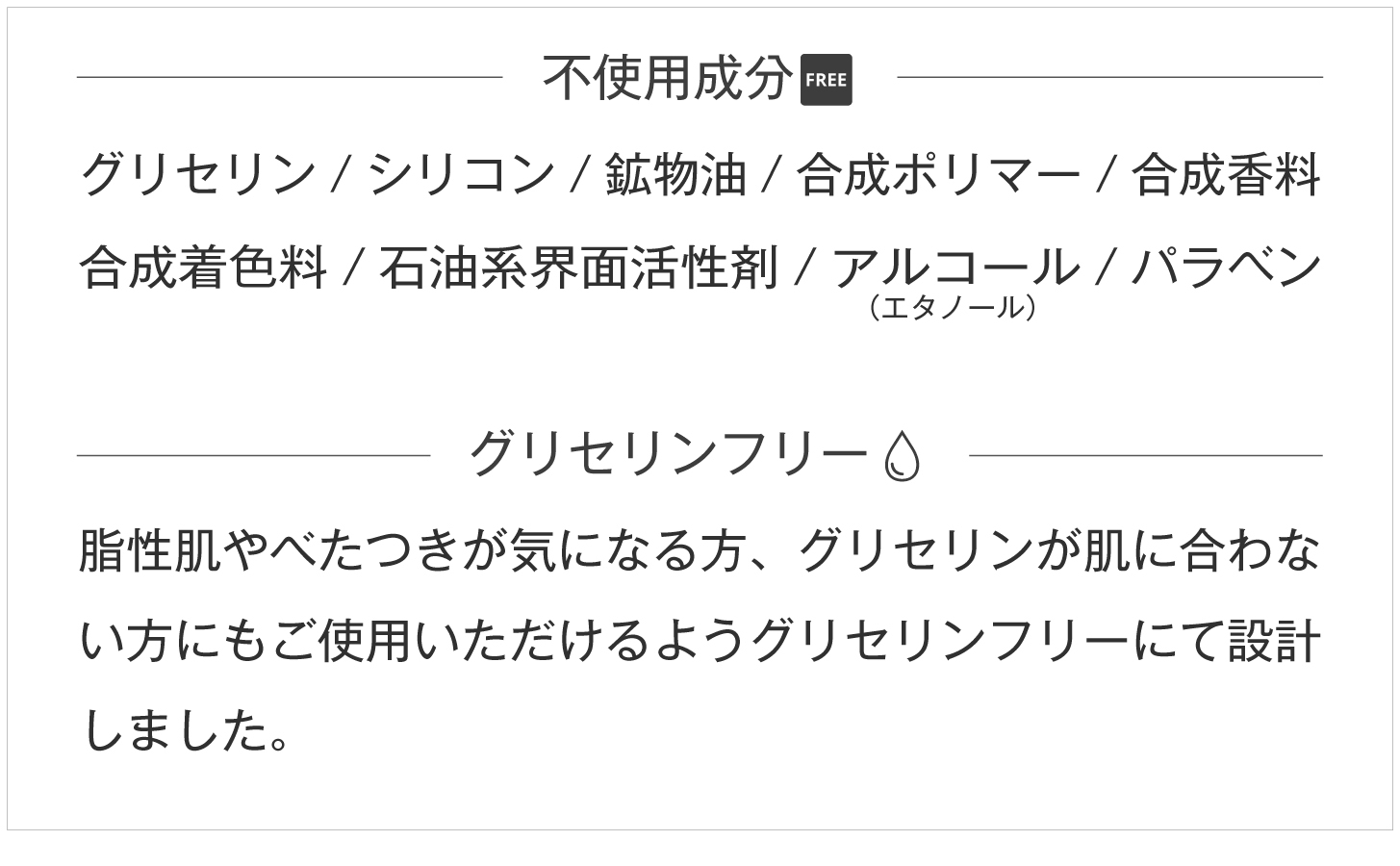 脂性肌やべたつきが気になる方、グリセリンが肌に合わない方にもご使用いただけるようグリセリンフリーにて設計しました。