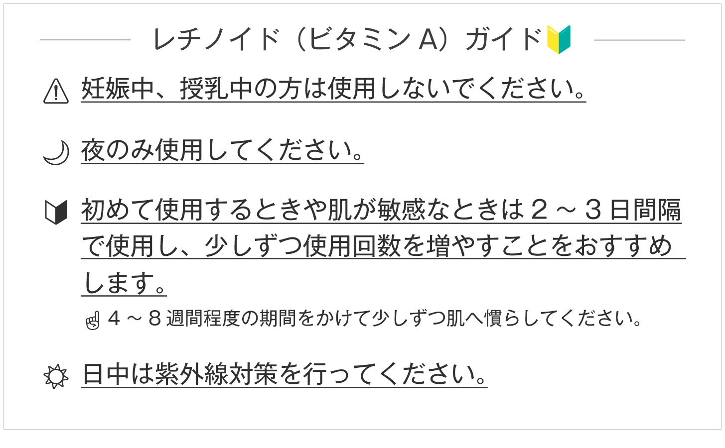 ・レチノールなどのビタミンA成分で起こりがちな赤み・皮むけなどの刺激が起こりにくく、レチノールに比べて安定性に優れ、紫外線・空気による分解が少ない美容成分です。