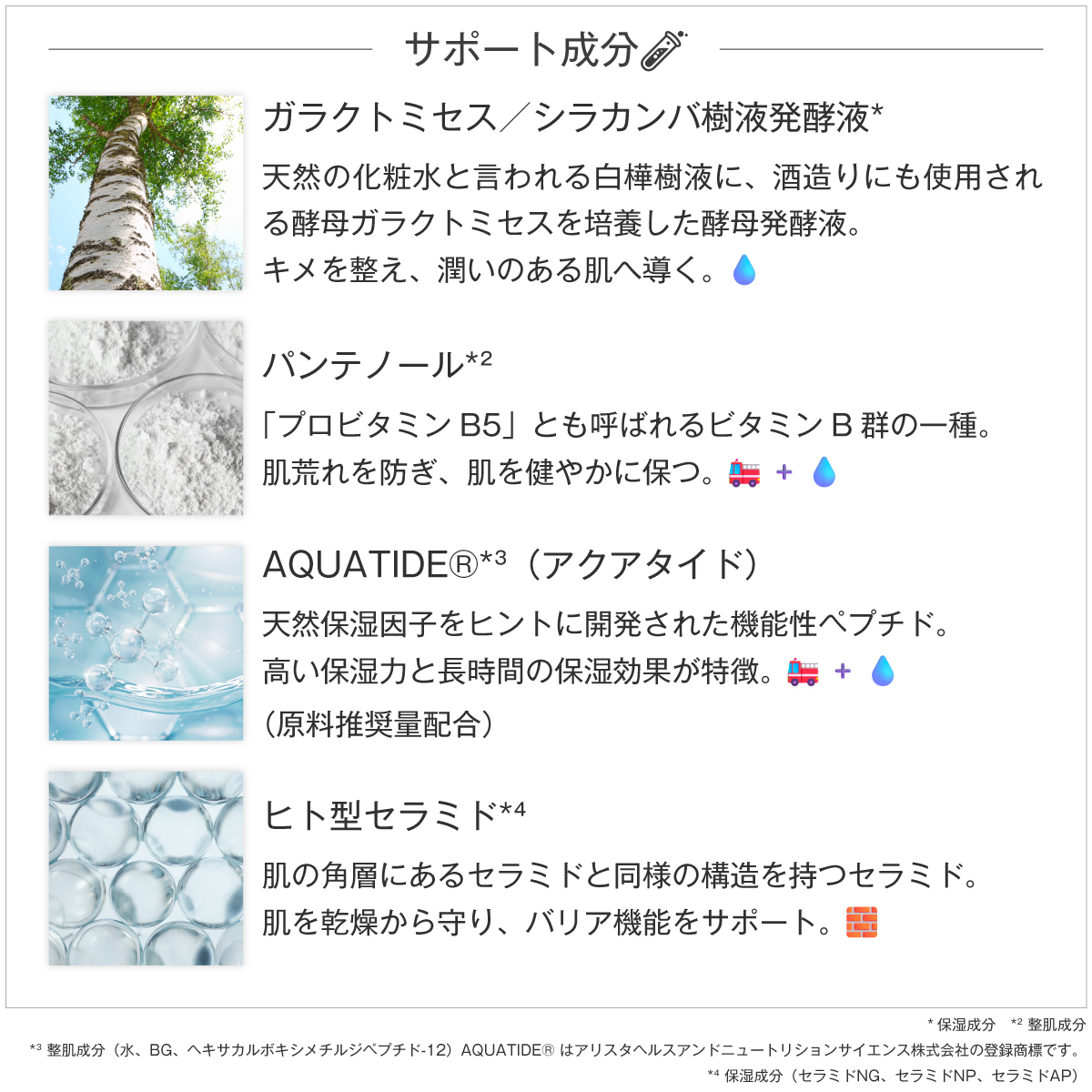 *¹ 保湿成分 *² 整肌成分 *³ 整肌成分(水、BG、ヘキサカルボキシメチルジペプチド-12)AQUATIDE® はアリスタヘルスアンドニュートリションサイエンス株式会社の登録商標です *⁴ 保湿成分(セラミドNG、セラミドNP、セラミドAP)