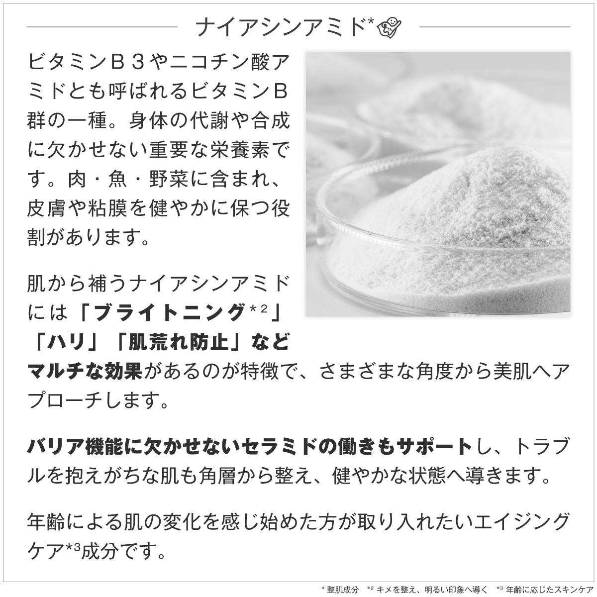 ・肌から補うナイアシンアミドには「ブライトニング*³」「ハリ」「肌荒れ防止」などマルチな効果があるのが特徴で、さまざまな角度から美肌へアプローチします。