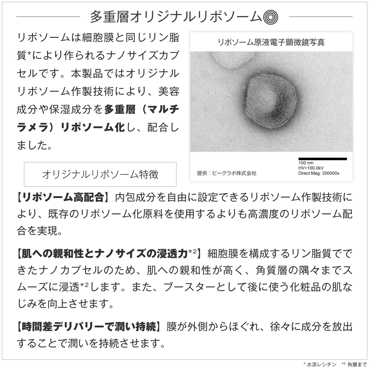 【肌への親和性とナノサイズの浸透力*²】細胞膜を構成するリン脂質でできたナノカプセルのため、肌への親和性が高く、角質層の隅々までスムーズに浸透*²します。また、ブースターとして後に使う化粧品の肌なじみを向上させます。